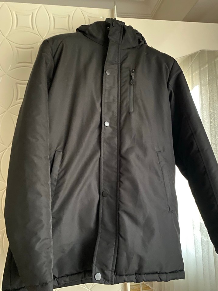 Siyah erkek montu , düğmeli önü ve kruvaze yaka ile tasarlanmıştır. %100 polyester , uzun kollu ve normal kesimdir. Minimalist ve desensiz yapısıyla günlük kullanım için uygundur. 3 adet cep bulunmaktadır , kapüşonludur isteğe bağlı olarak çıkarılabilir