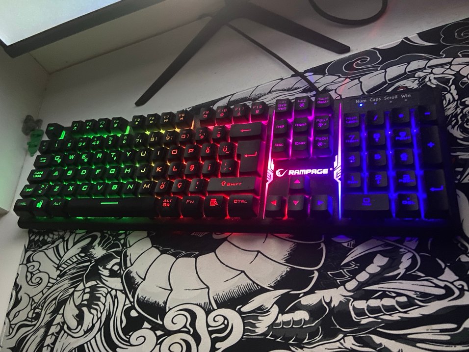 Çok renkli, canlı ışıklandırmaya sahip kablolu klavye. Standart tuş düzeni ile kullanışlıdır rampage marka çok uygun tuttum fiyatını eski klavyem