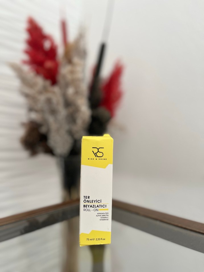 RS markalı, parlak sarı ambalajda ter önleyici ve beyazlatıcı roll-on. 75 ml hacmindedir.