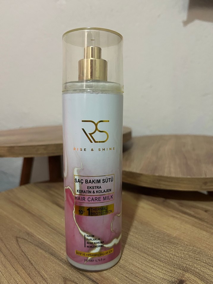 RS saç bakım sütü, keratin ve kolajen içerir. Saçı besler, ısıya karşı korur ve parlaklık kazandırır.