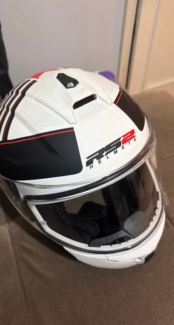 Beyaz, gri ve siyah detaylı baskılı desenli biker motosiklet kaskı. Şeffaf vizörlü ve güvenli tutuş için Velcro bantlıdır. Kauçuk kaplamalı, rock punk tarzı yansıtıyor. L bedendir 2 kez kullanıldı