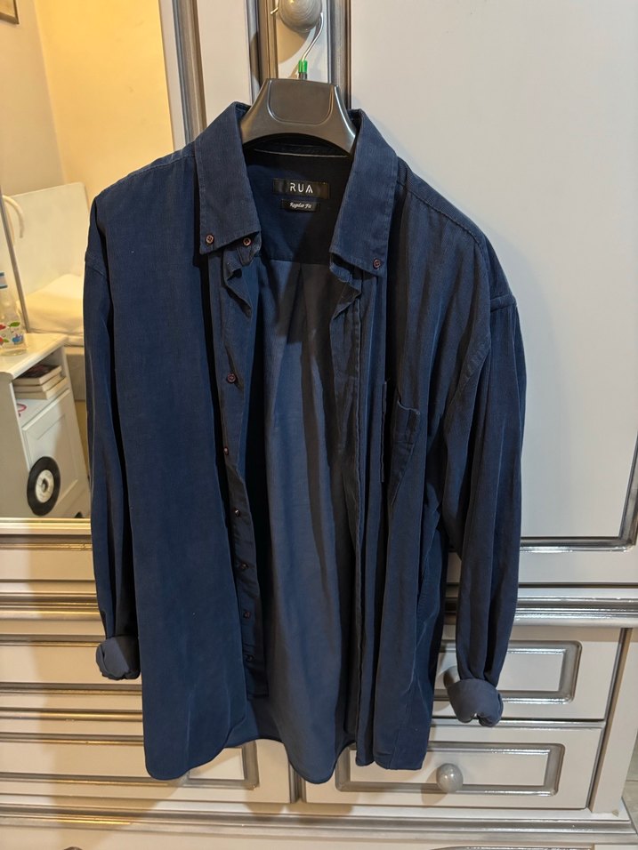 RVA marka koyu mavi denim gömlek, yakalı, düğmeli, uzun kollu ve bol kesimdir, gündelik ve ofis kullanımı için uygundur.
