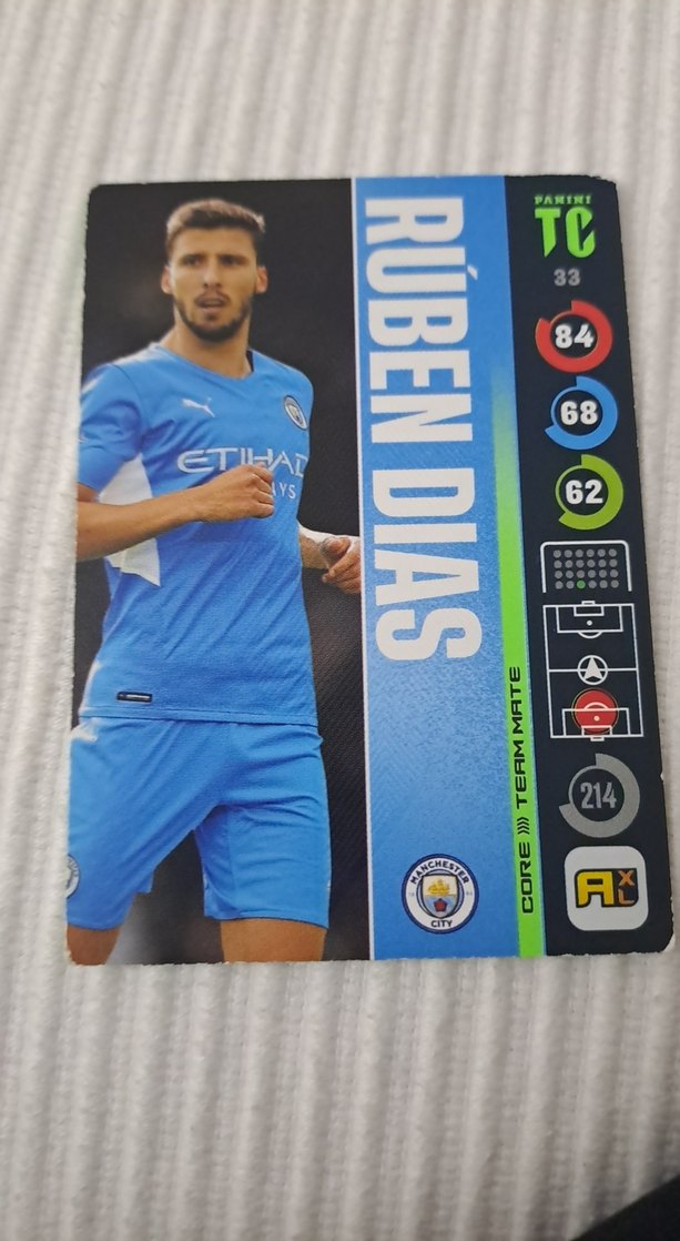 Koyu mavi Ruben Dias rozeti, oyuncu istatistikleri ve Manchester City logosu ile trendy casual streetwear tarzına uygun. ⚽