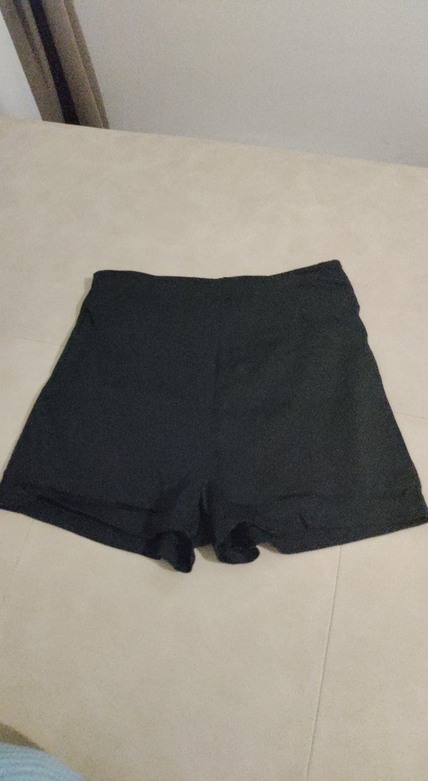 Düz siyah, dar kesim kadın mini şort, rahat sentetik kumaştan. ✨