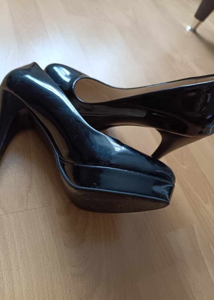 Siyah rugan platform topuklu ayakkabi. 10-12 cm topuk boyu. 3-4 kez giyildi.