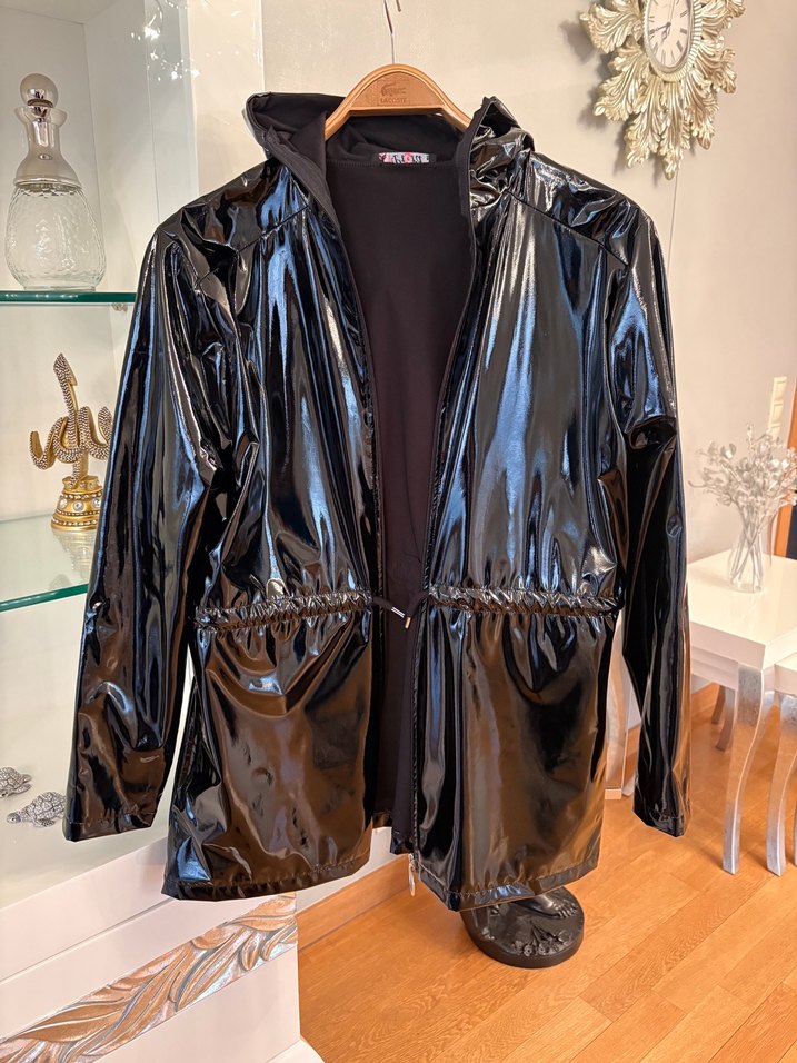 Parlak siyah deri, normal uzunlukta ve fitted kesim yağmurluk, notched lapel yakalı, uzun kollu, günlük kullanım için uygun.