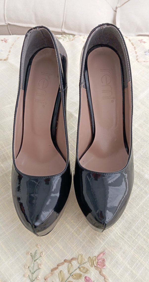 Siyah rugan platform ince topuklu 40 numara ayakkabı. 39'larda tercih edebilir. Özellikle ayağınız biraz taraklıysa. Ufak teke çizikleri var ama iyi durumda, asla kötü görünmüyor.