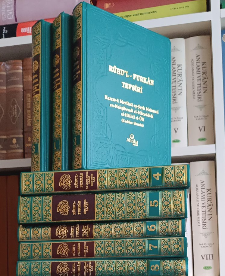 Hazrat-i Mervani'nin tefsiriyle Rü'ûl-Purean, ayrıntılı dini açıklamalar içeren yeşil kapaklı kitap seti. rahle boy