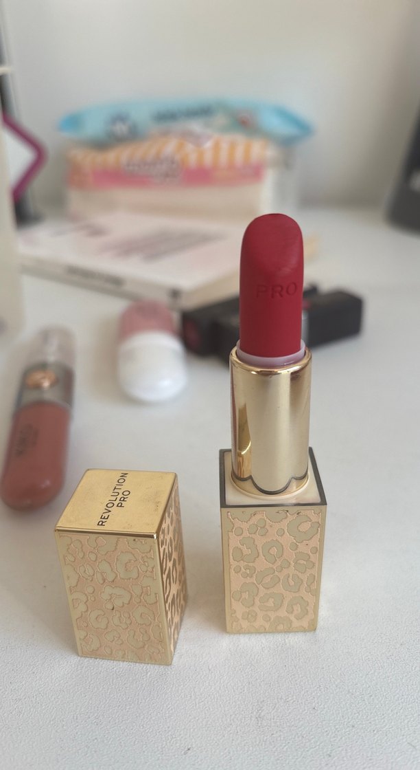 Revolution Pro kırmızı ruj, canlı renkte ve pürüzsüz dokuda, şık altın kapaklıdır. Sadece bir kez denendi.