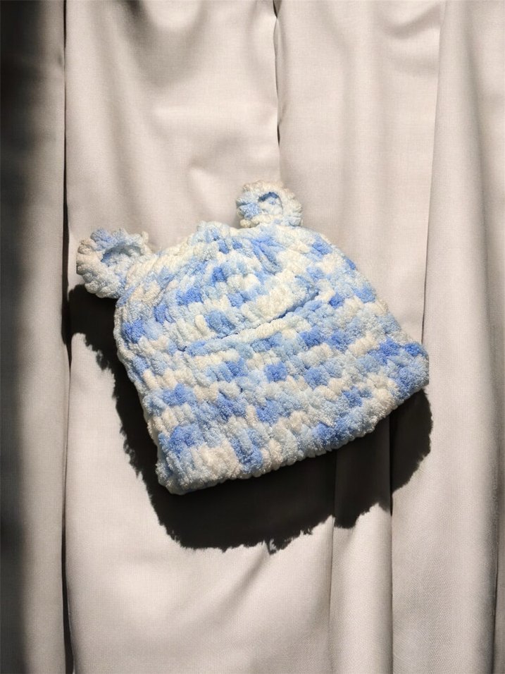 Bu örgü çocuk beresi, pastel mavi bağlamalı desen ve üstte iki küçük ponpon ile rahat ve eğlenceli bir tarz sunar.