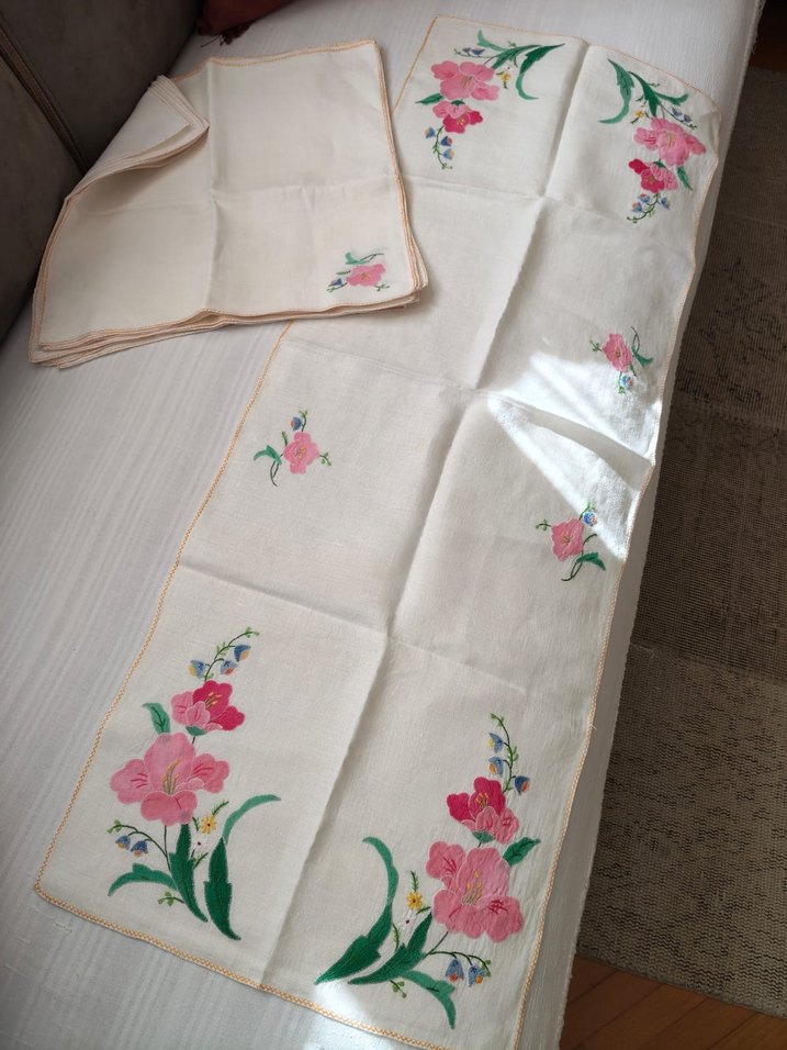 Runer ve peçete takım bir kere kullanılmış yıkanmış hiçbir lekesi yok ingiliz keten üzerine pembeli aplike işli runer 100x36 bir adet peçete 36x36 sekiz adet