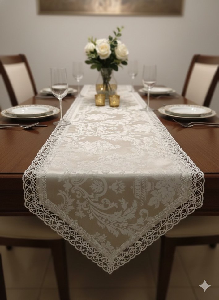 Narin nakış desenleri ve dantel kenarlarıyla beyaz runner örtüsü, yemek masanıza zarif bir dokunuş katar.