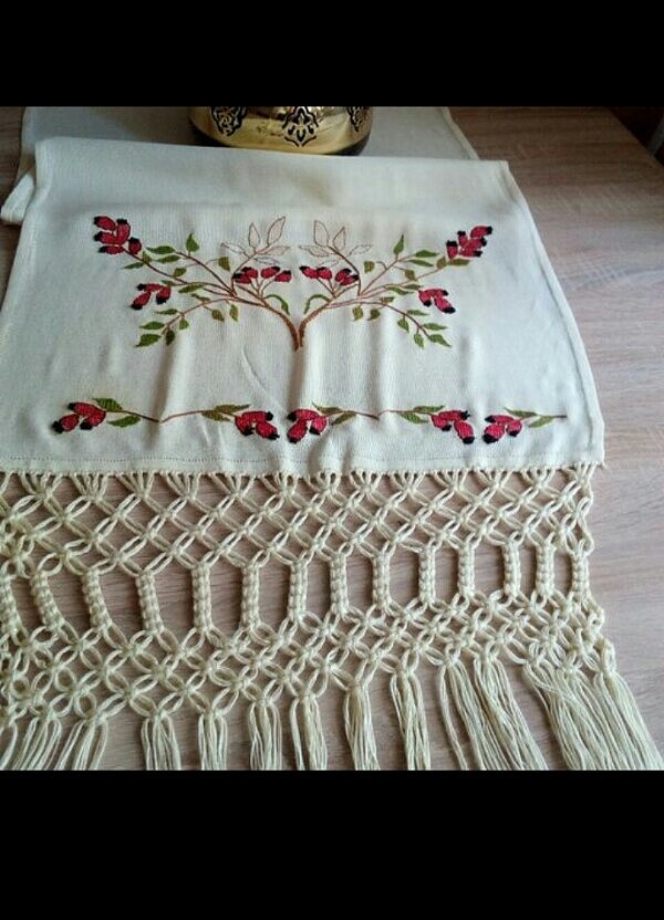 El emeği Bursa keteni üstüne kasnakta iğne ardı ve tohum işi yapıldı.Eni 50 cm.boyu saçaksız 1.57 cm.saçak boyu 34 cm.
