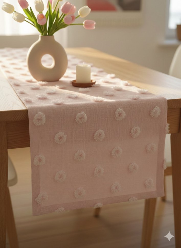 Pastel pembe renkte, nakışlı detaylara sahip modern klasik tarzda masa örtüsü, masanıza yumuşak ve şık bir dokunuş katıyor.