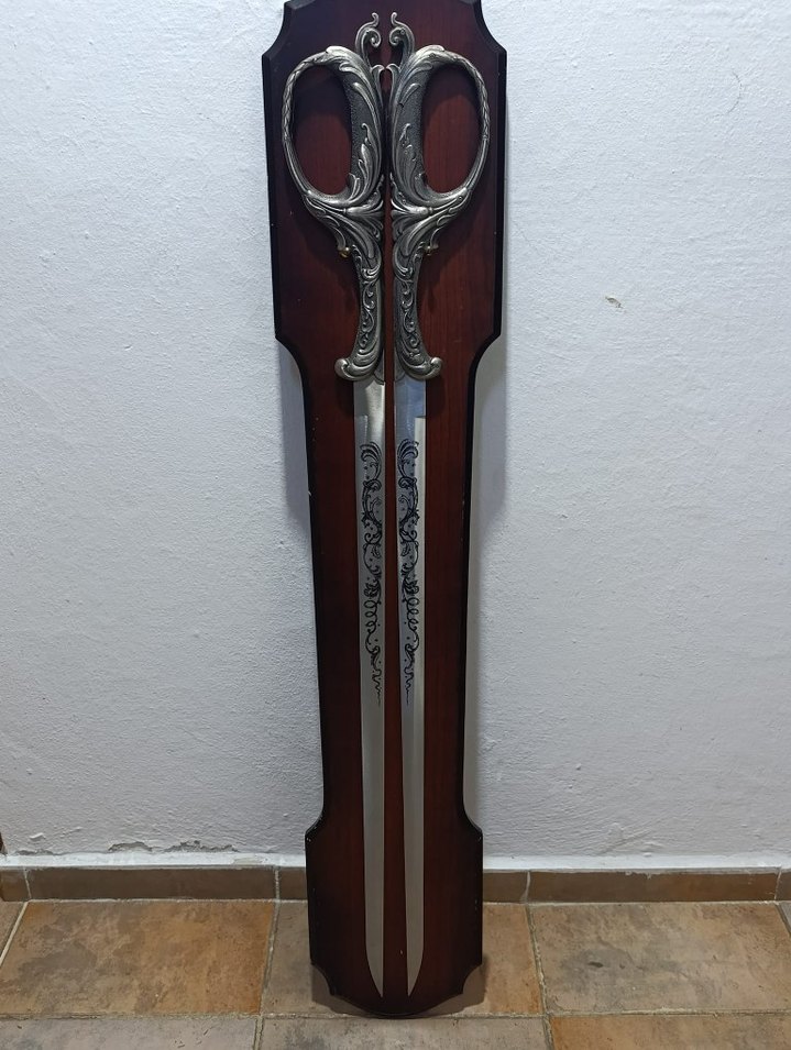 Bordo parlak ahşap taban üzerinde iki adet Rus Katanası