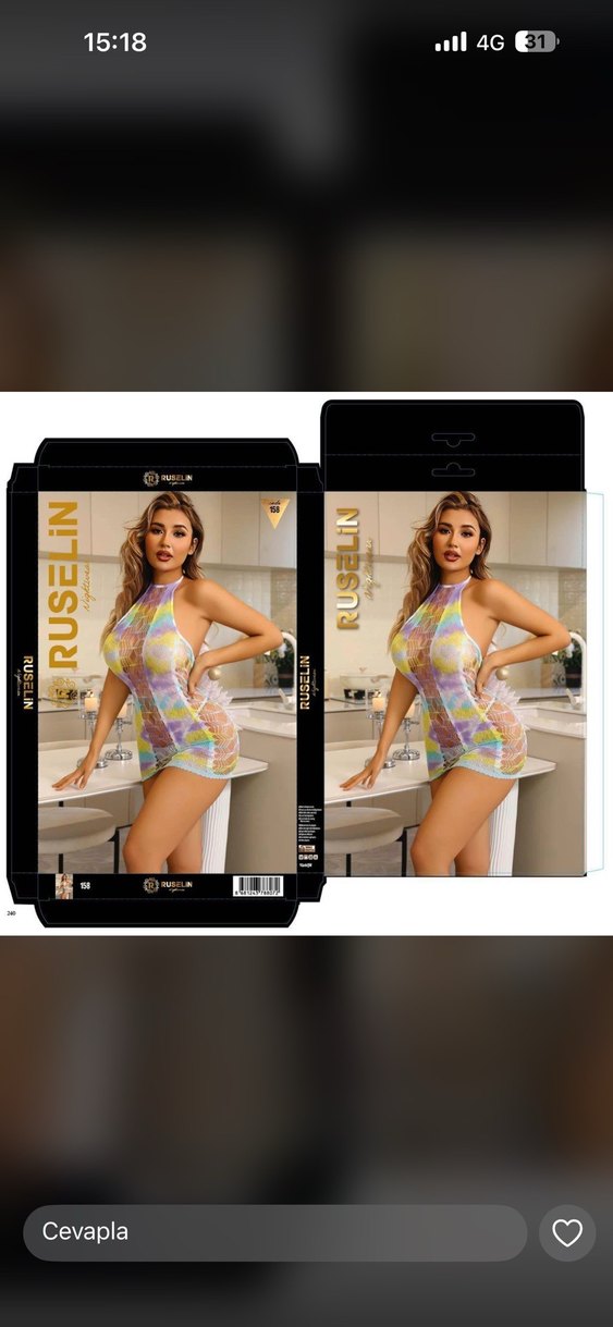 Ruşelin renkli baskılı, kolsuz, mini uzunlukta, pop kültür esintili dar kesim kadın geceliği.