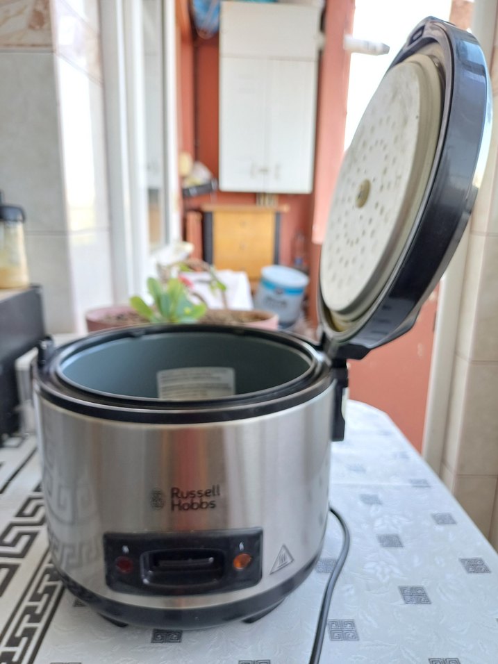 Kapaklı ve kontrol paneli bulunan Russell Hobbs gri yemek ısıtıcı, yiyecekleri sıcak tutmak için uygundur.