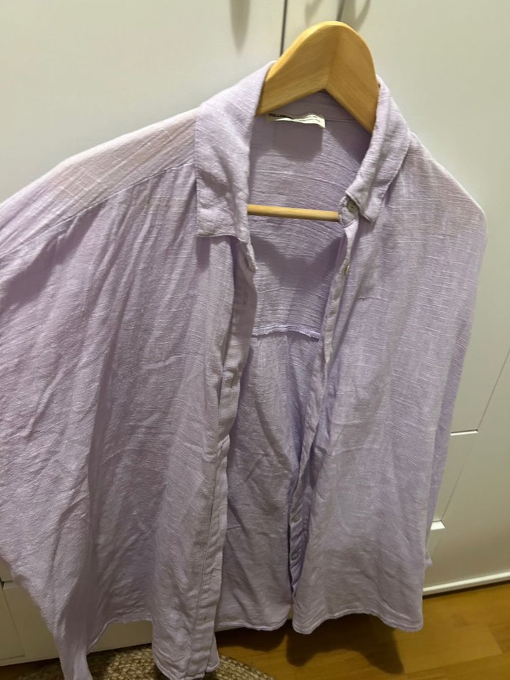 Yumuşak keten kumaştan, bol kesim, pastel mor renkli, yakalı, düğmeli ve uzun kollu bohem tarzda kadın gömleği.