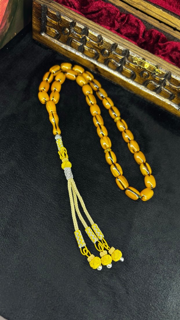 Canlı sarı renkte, konvansiyonel tarzda erkek tesbih boncukları. Pürüzsüz oval boncuklar ve dekoratif püsküllerle renkli ve bohem bir aksesuar.