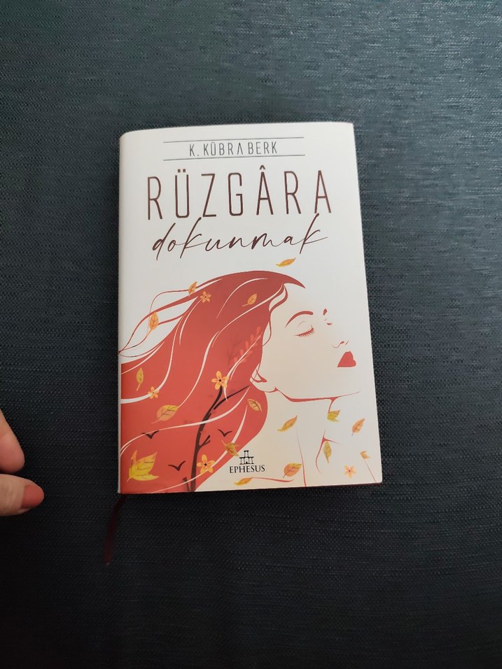 K. Kübra Berk'in "Rüzgara Dokunmak" romanı, duygu ve bağ temalarını işler. Kapakta yapraklarla süslü kadın yüzü yer alır.
