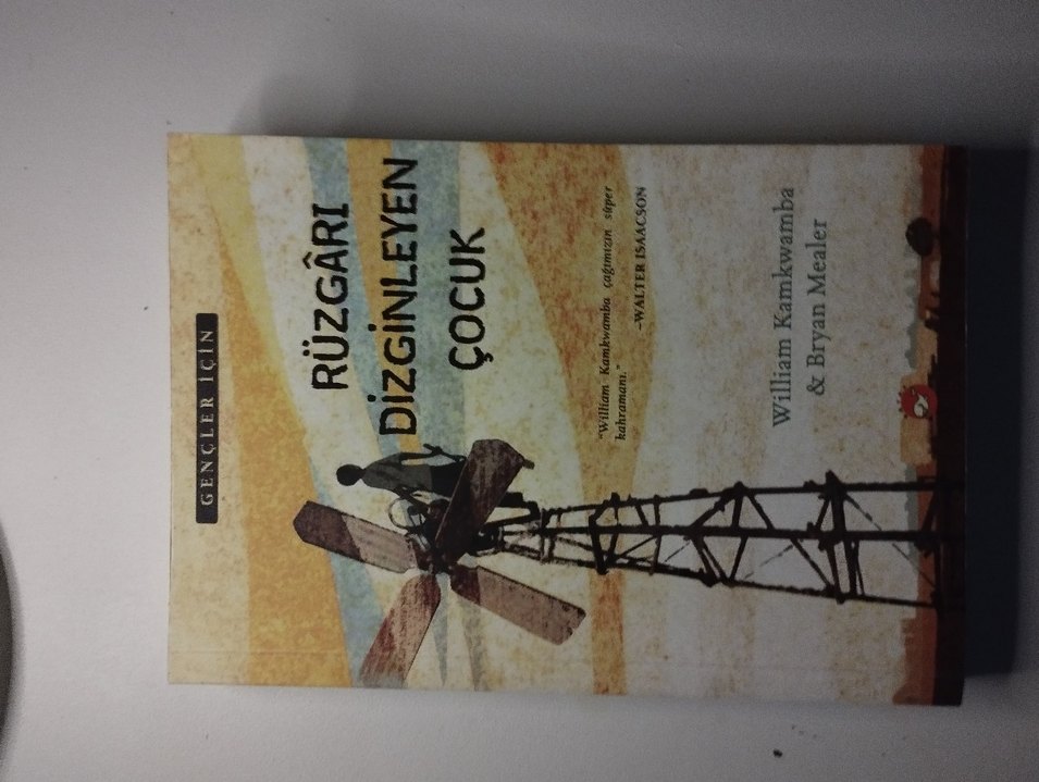 William Kamkwamba'nın "Rüzgârı Dizginleyen Çocuk" kitabı, rüzgar türbini illüstrasyonlu ve koyu kamel tonlarında kapağa sahip.