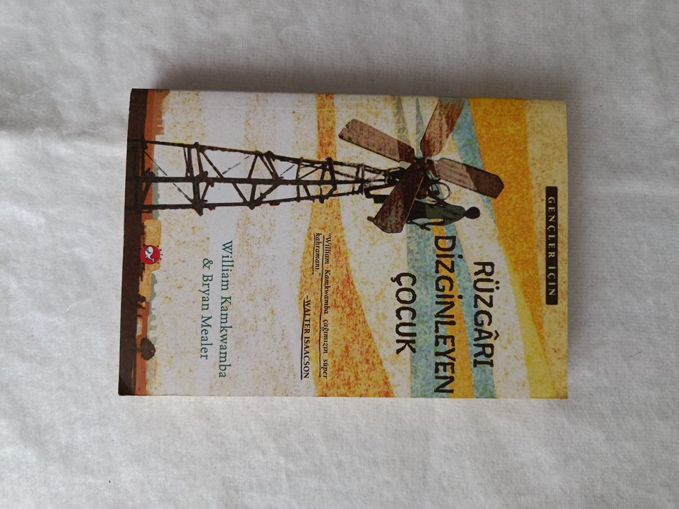 William Kamkwamba ve Bryan Mealer'in yazdığı 'Rüzgarı Dizginleyen Çocuk' kitabının kapağında rüzgar türbini resmi ve koyu camel renk hakimdir. ️Bazı sayfalar çizilmiştir.