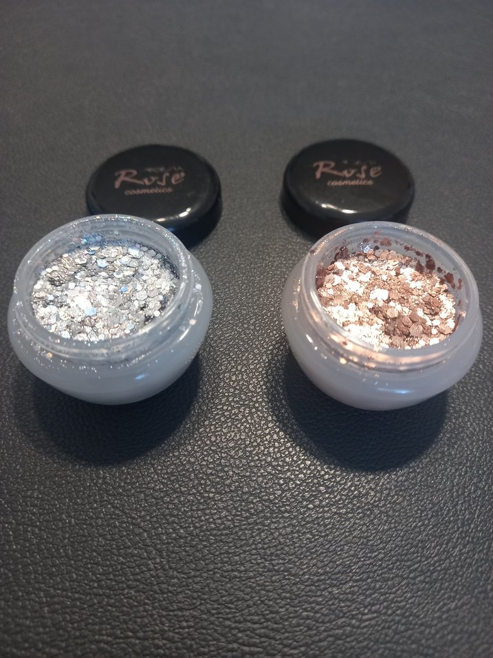 Rvse markalı parlak pudralar, bej ve gümüş tonlarında, ışıltı katmak için uygundur. Kapaklı küçük kutularda sunulur. ✨