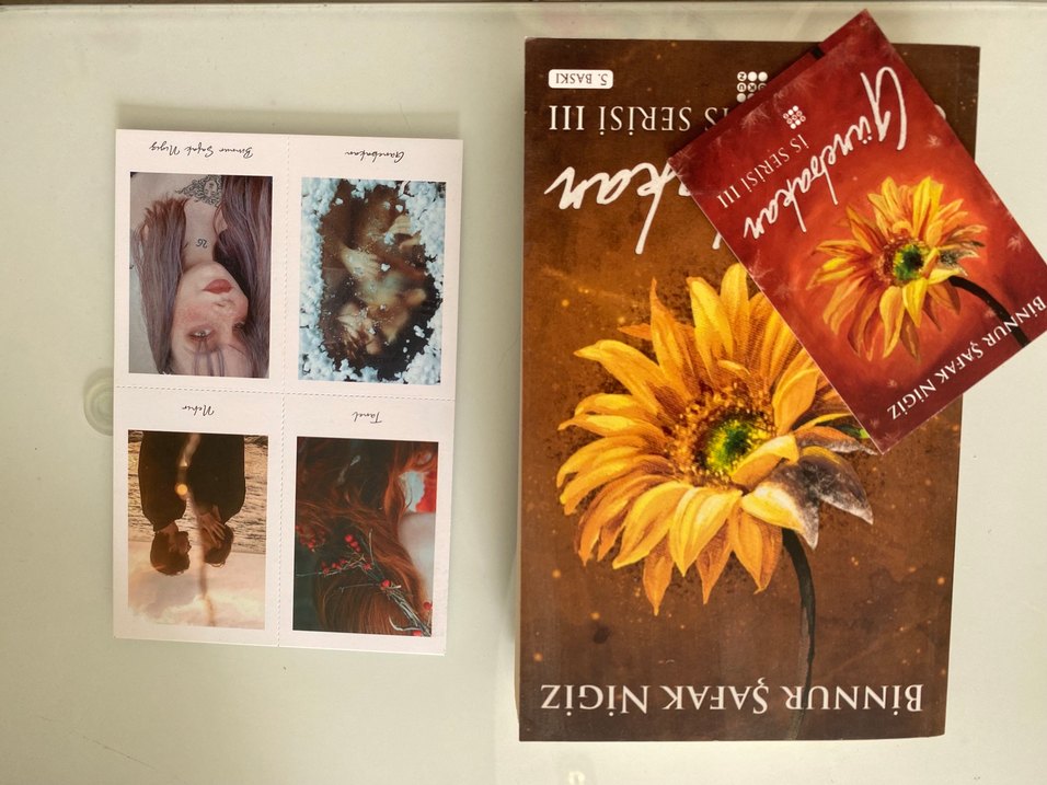 S. Başkı'nın 'Şiir Serisi III' adlı şiir kitabı, kapakta ayçiçeği görseliyle birlikte çeşitli resimlerin bulunduğu ek kartlar içerir.