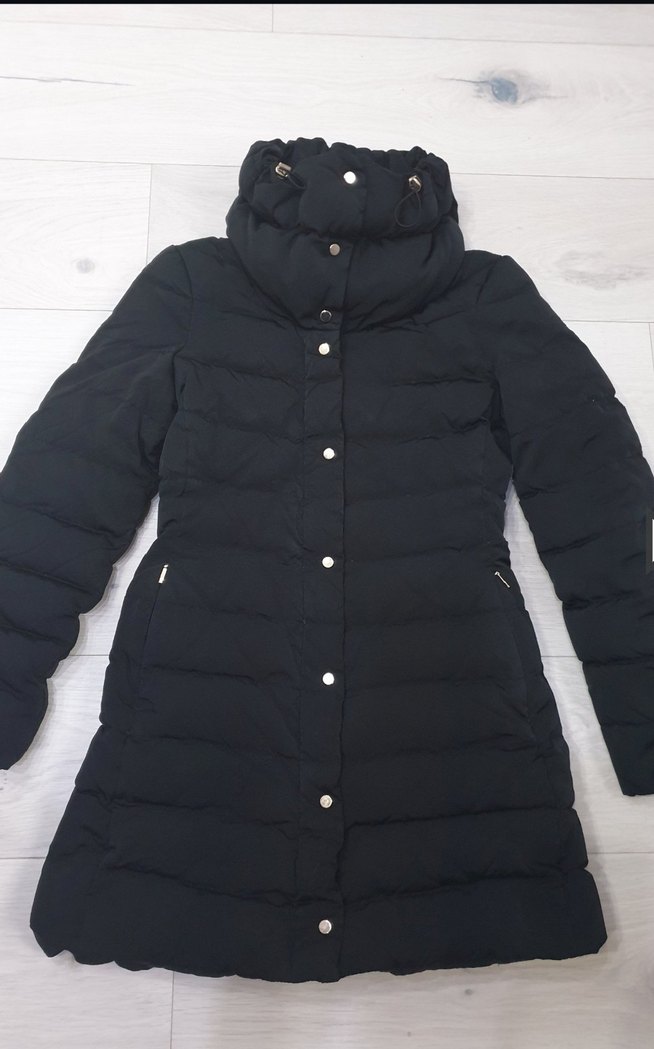 Zara marka S beden...Düğmeli, uzun siyah kışlık mont, notched lapel yaka ve dar kesim. Sentetik kumaştan, rahat ve sıcak sokak stili, günlük kullanıma uygun. ❄️