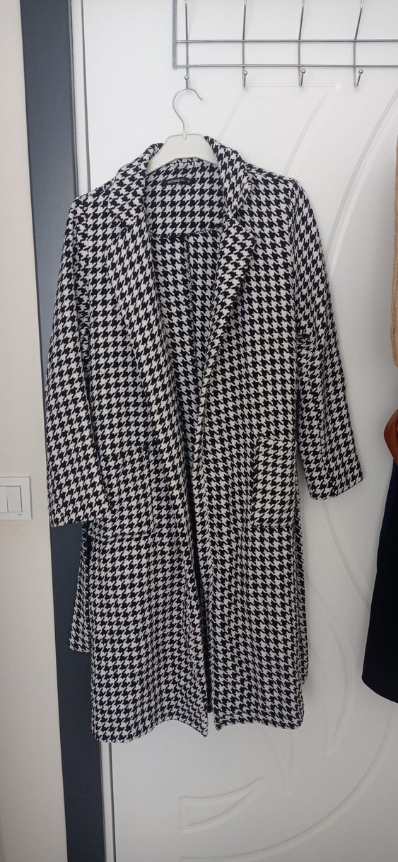 Düğmeli, gri ekose desenli uzun kadın kaban. Notch yaka, regular fit ve uzun kollu, sentetik kumaştan yapılmıştır. Günlük kullanım için uygundur. s beden