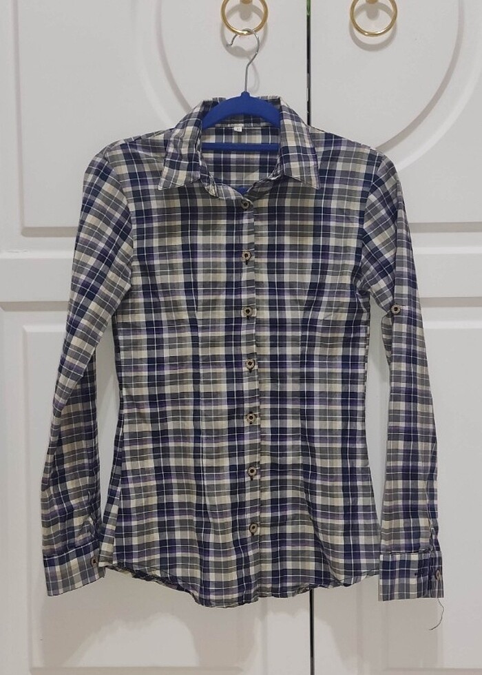 İyi durumdadır. Makul. S Beden Kadın Ekose Kısa Kollu Önden ve Arkadan Pileli Gömlek