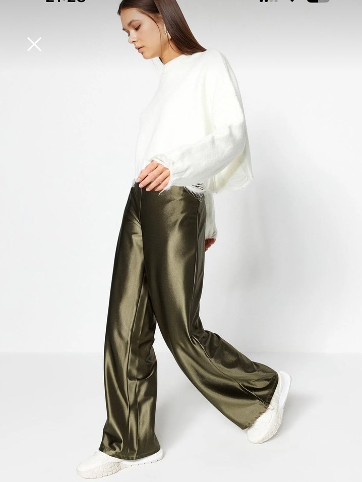 Kadınlar için salaş kesim, parlak ve saten dokulu, drapeli haki pantolon. Midi boy ve günlük kullanım için uygun sokak stili.