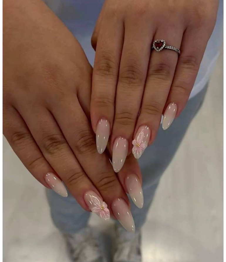 Beyaz pastel tonlarda, 3D çiçek detaylı tırnak süsleri, tırnaklara zarif ve yumuşak bir görünüm kazandırır.