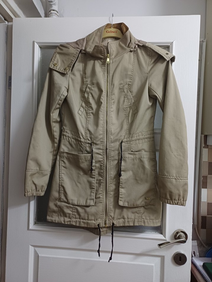belindeki ve etek kismindaki bagciklardaki deriler dokuluyor arka kisminda ufak bir leke var iki kol arasi 42 cm omuzdan boy 74 cm arka kisminda citcitli yirtmac vardir