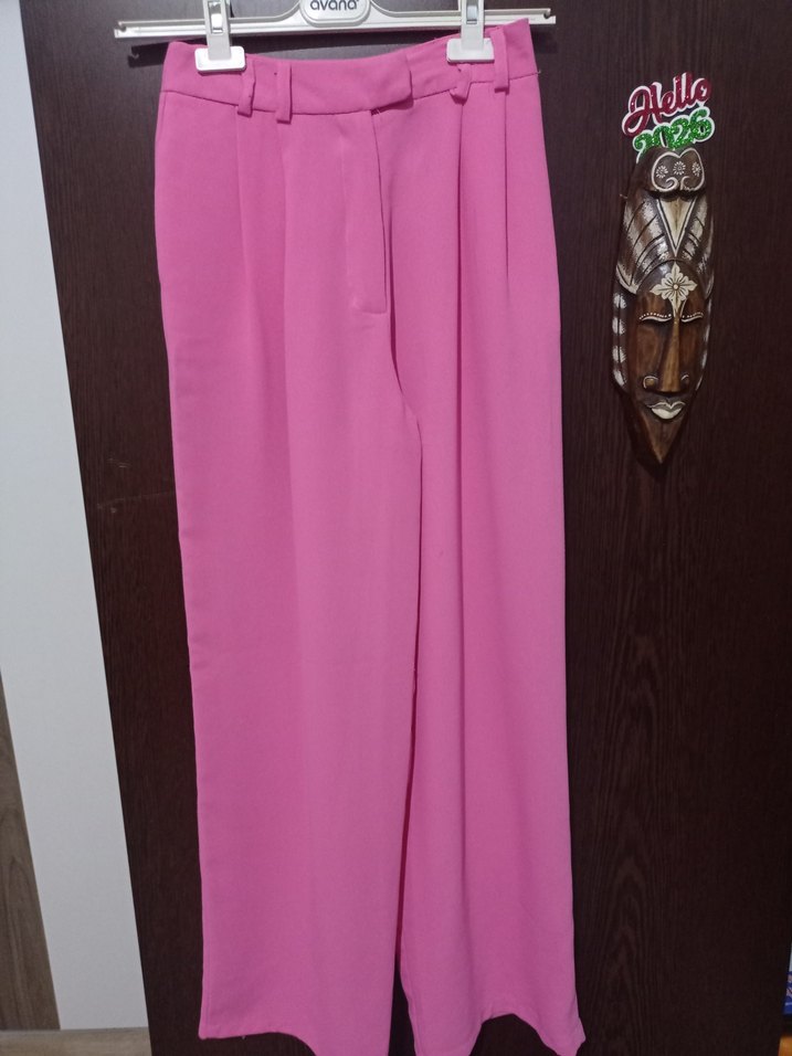 Uzun, regular fit pembe pilili kadın kumaş pantolon. Sentetik kumaştan, minimalist sokak stili ve ofis kullanımı için uygun. bir kez kullanıldı oldukça şık