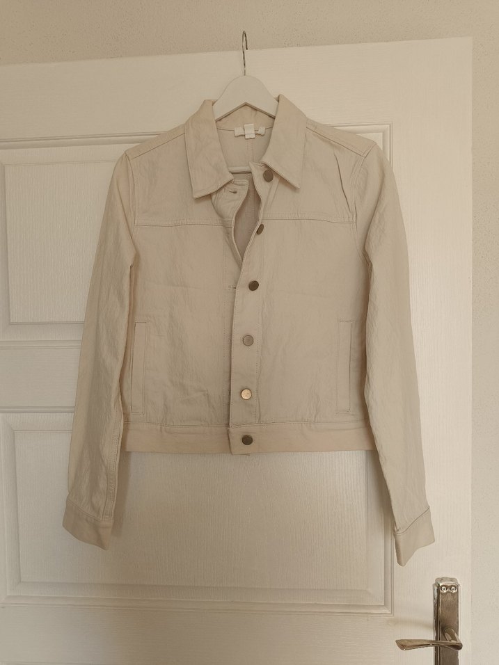 Bej renkli, keten dokulu düğmeli denim ceket. Notlu yaka, uzun kollu ve regular fit kesim. Günlük kullanıma uygun minimal tasarım. ürün hiç kullanilmadi marka temsili