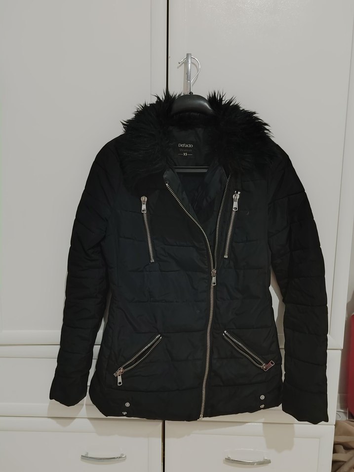 Siyah renk, suni kürklü yakaya ve askılı kollara sahip, sokak stili esintili, normal boy, dar kesim kadın mont.