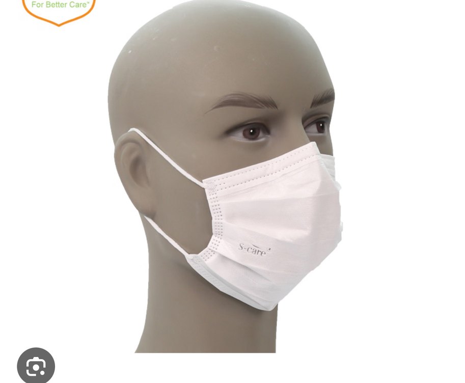 S-care beyaz tek kullanımlık maske, kulak askıları ile rahat kullanım sağlar. Günlük koruma için uygundur. ️