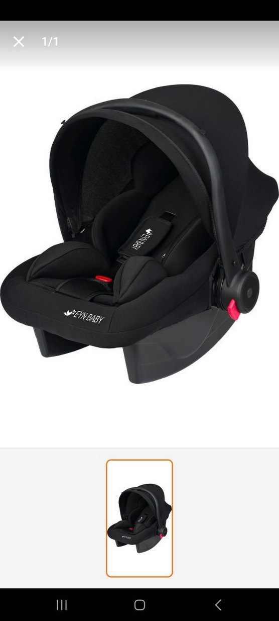 S-EYNBABY bebek oto koltuğu, koyu siyah renkte koruyucu tente ve konforlu dolguya sahip. Güvenli kemer sistemi içerir.