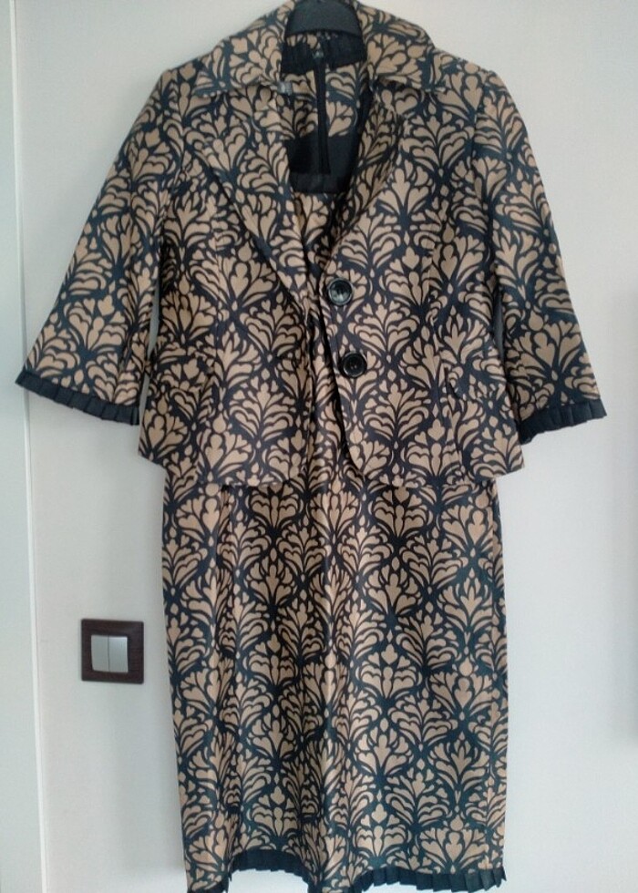 Ceket ve elbiseden oluşan Koton marka şık bir takım. 36 beden, elbise etek boyu diz altıdır. Defosu kusuru yok. Elbise arkadan fermuarlıdır. Elbise boyu ve eni fotoğraflardaki gibi 107-40 cm