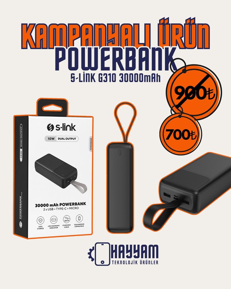 S-link G310 30000mAh kapasiteye sahip, çift USB, Type-C ve Micro girişli powerbank. 10W çıkış gücü ve taşıma halkası bulunur. Siyah renk.