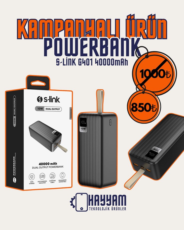 S-Link G401 powerbank, 40000mAh kapasite, çift çıkış ve 10W şarj gücü sunar. Koyu siyah renkte, taşıma için askı ile birlikte gelir.