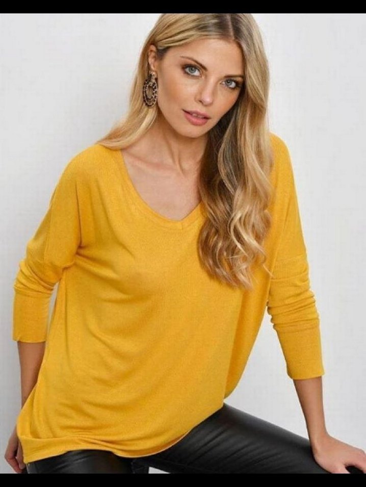 Sarı renkli, V yaka ve uzun kollu, salaş kesim kadın kazak. İpeksi dokusuyla hafif ve şık bir görünüm sunar. Günlük kullanım için uygundur.