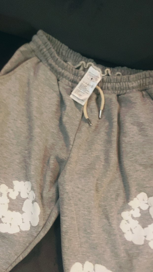 Gri pamuklu, bol kesim, beyaz bağlama desenli ve düğme detaylı, normal boyda, bağcıklı eşofman altı.