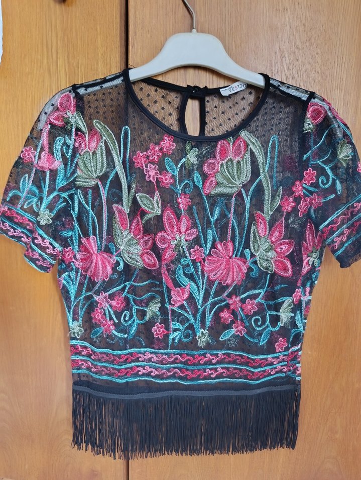 Bohem tarzda, kısa kollu ve yuvarlak yakalı bu bluz, nakışlı renkli çiçek desenleri, dantel detayları ve püsküllü etek ucu ile parti için uygundur. yeni gibidir