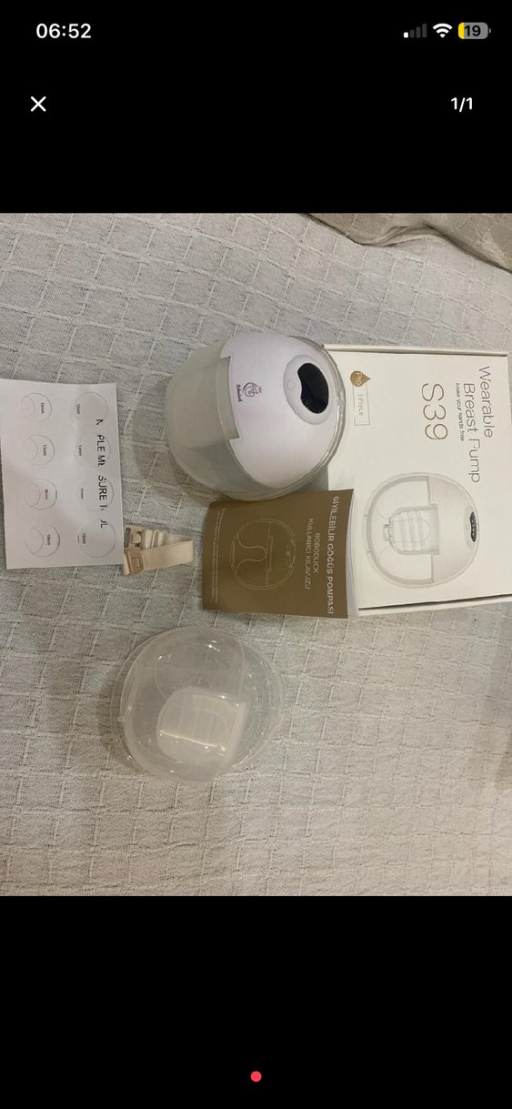 S39 beyaz renkli taşınabilir göğüs pompası, kullanışlı ve kompakt tasarıma sahiptir. Şeffaf toplama şişesi ve kullanım kılavuzu dahildir.