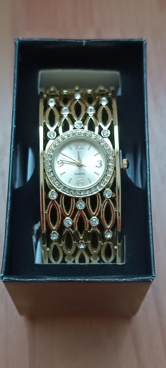 Sıfır. Kutusu mevcut. Pilsizdir. İçindeki pil bitmiş durumda. Altın rengi ve taşları ile hem saat hem bileklik işlevindedir. Kelepçe şeklinde şık tasarımlı saat.
