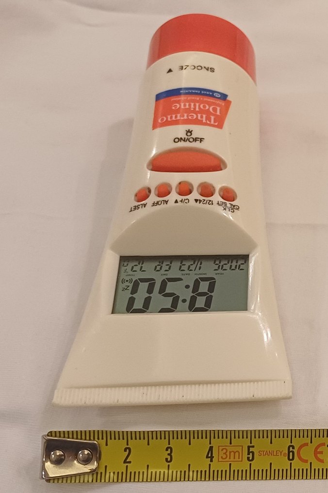 Krem tüpü görünümlü saat. Alarmlı, takvimli, 12 veya 24 saat olarak ayarlanabilir. Pilleri ile gönderilecektir
