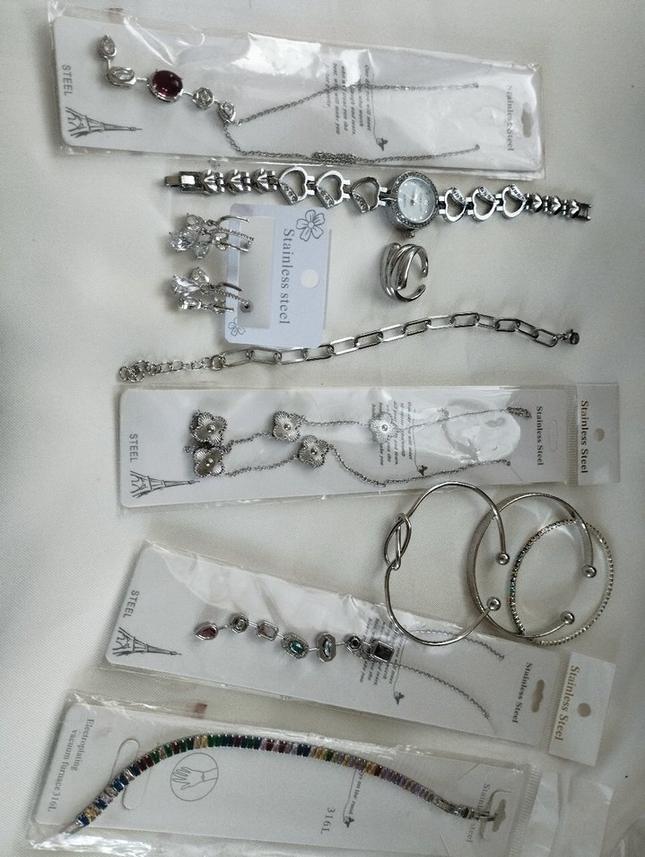 Paslanmaz çelikten yapılmış, renkli zincir detaylı kadın takı seti. Kolye, kalpli saat, yüzük ve küpeler içerir. Günlük kullanıma uygun çağdaş Paris tarzı. ⌚ gorseldekilerin hepsi gönderilecektir