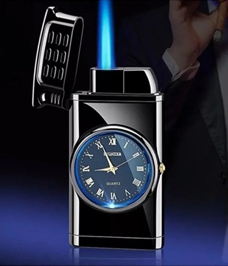 Saatli Siyah Işıklı Metal Turbo Gazlı Çakmak